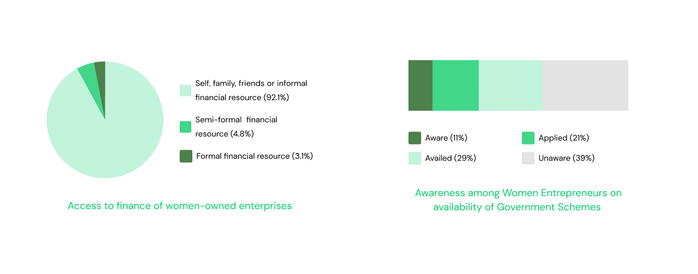 Left: Sources of Financing for Women-owned Enterprises. Right: Awareness of the availability of Govt. Schemes (Source)