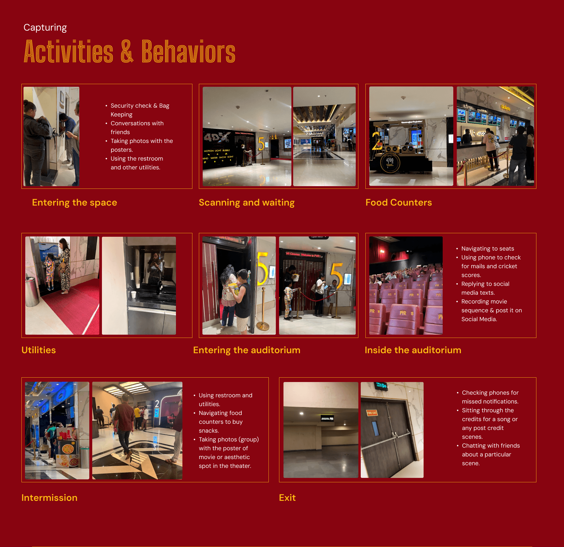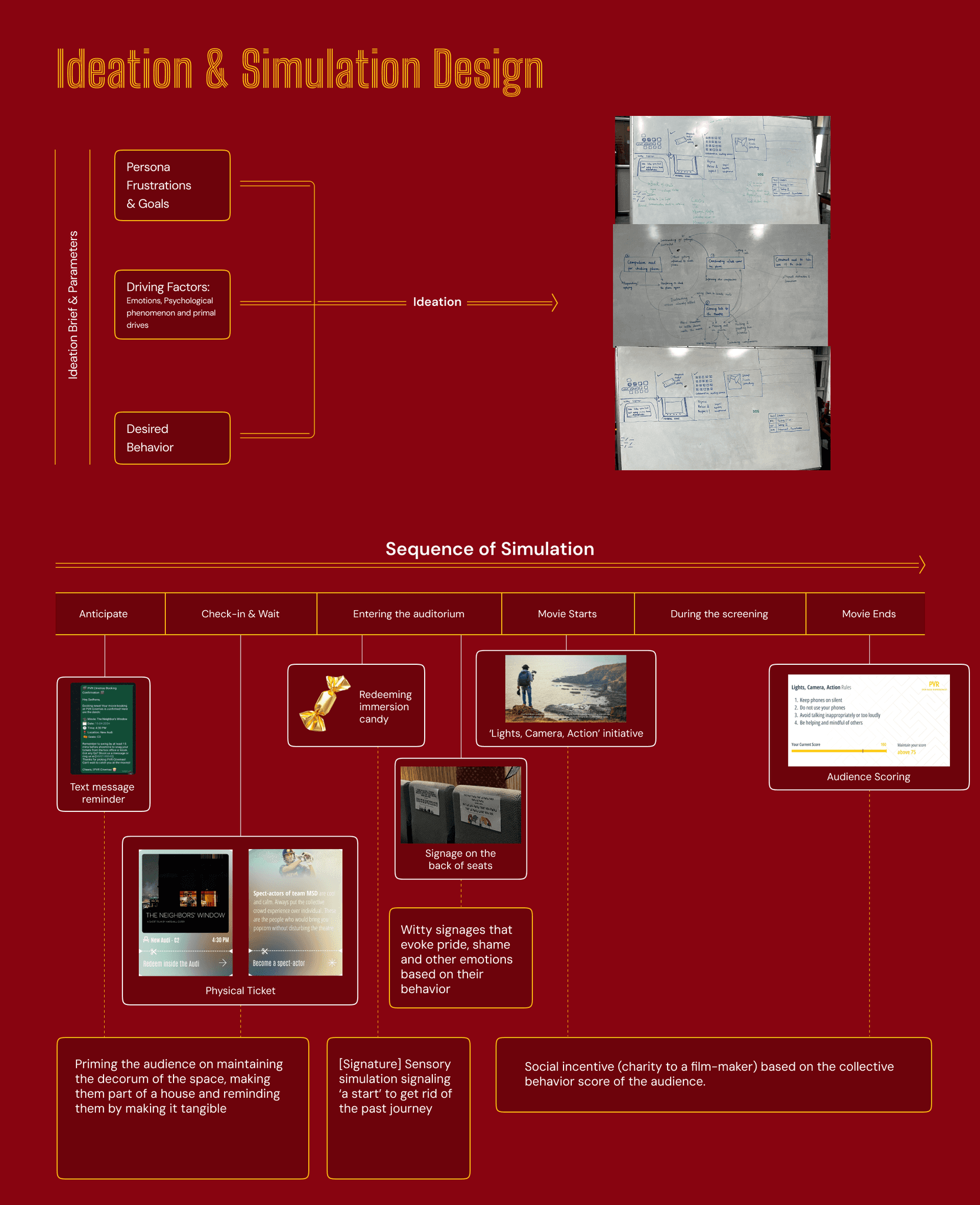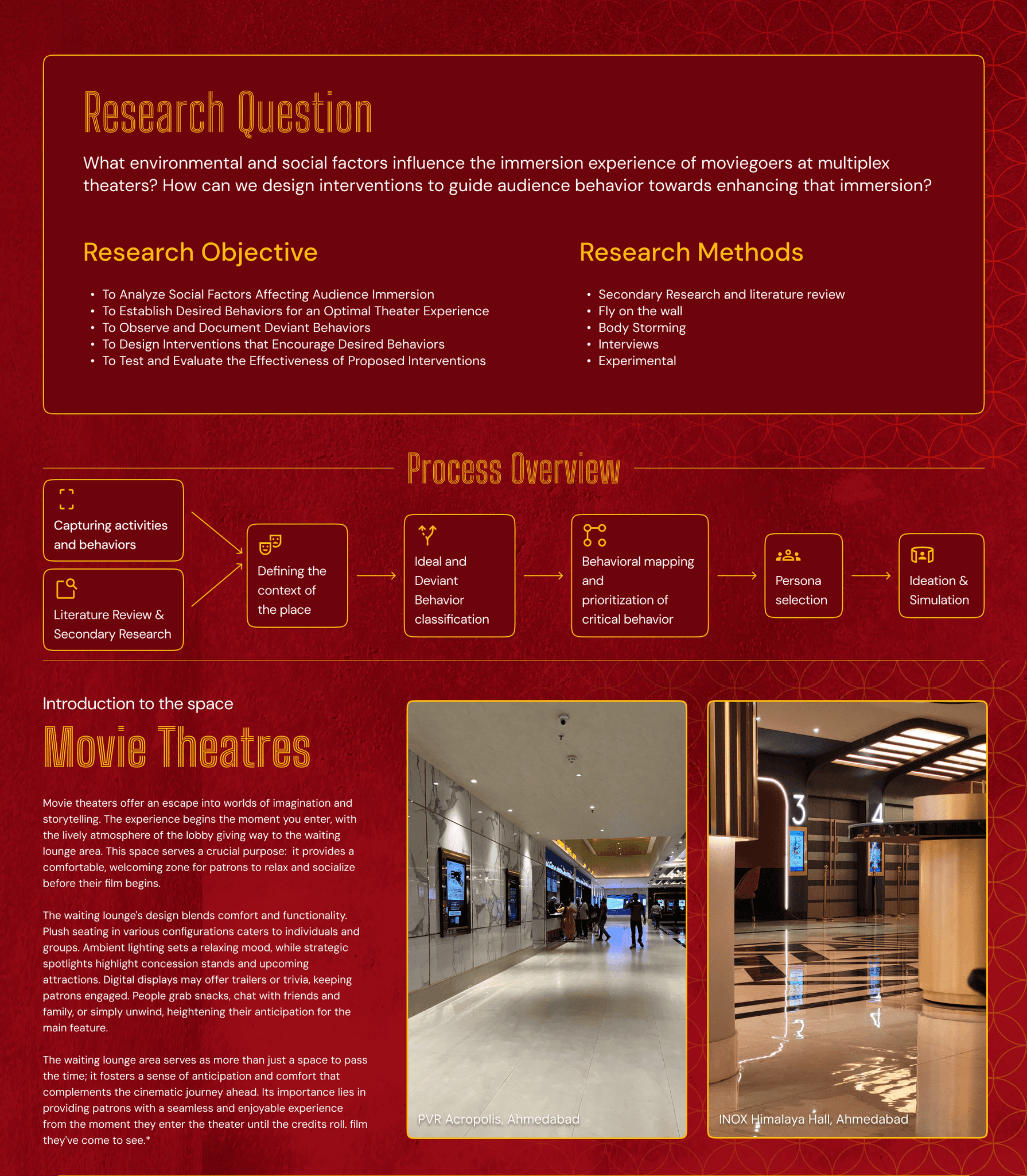 This project was dedicated to studying audience behavior in a theater setting, with a particular focus on understanding what impacts immersion and expected behavior. By closely observing theatergoers, we documented their actions, preferences, and any instances where their behavior deviated from the norm. This careful observation allowed us to identify the root causes behind behaviors that disrupted the immersive experience, whether it was due to environmental factors, distractions, or social influences. To address these issues, we designed a series of subtle yet targeted behavioral interventions. These interventions, or nudges, were intended to encourage contextually desired audience behavior, enhancing the theater experience without restricting personal freedom. This project underscores the importance of creating environments that foster deep engagement and seamless immersion.