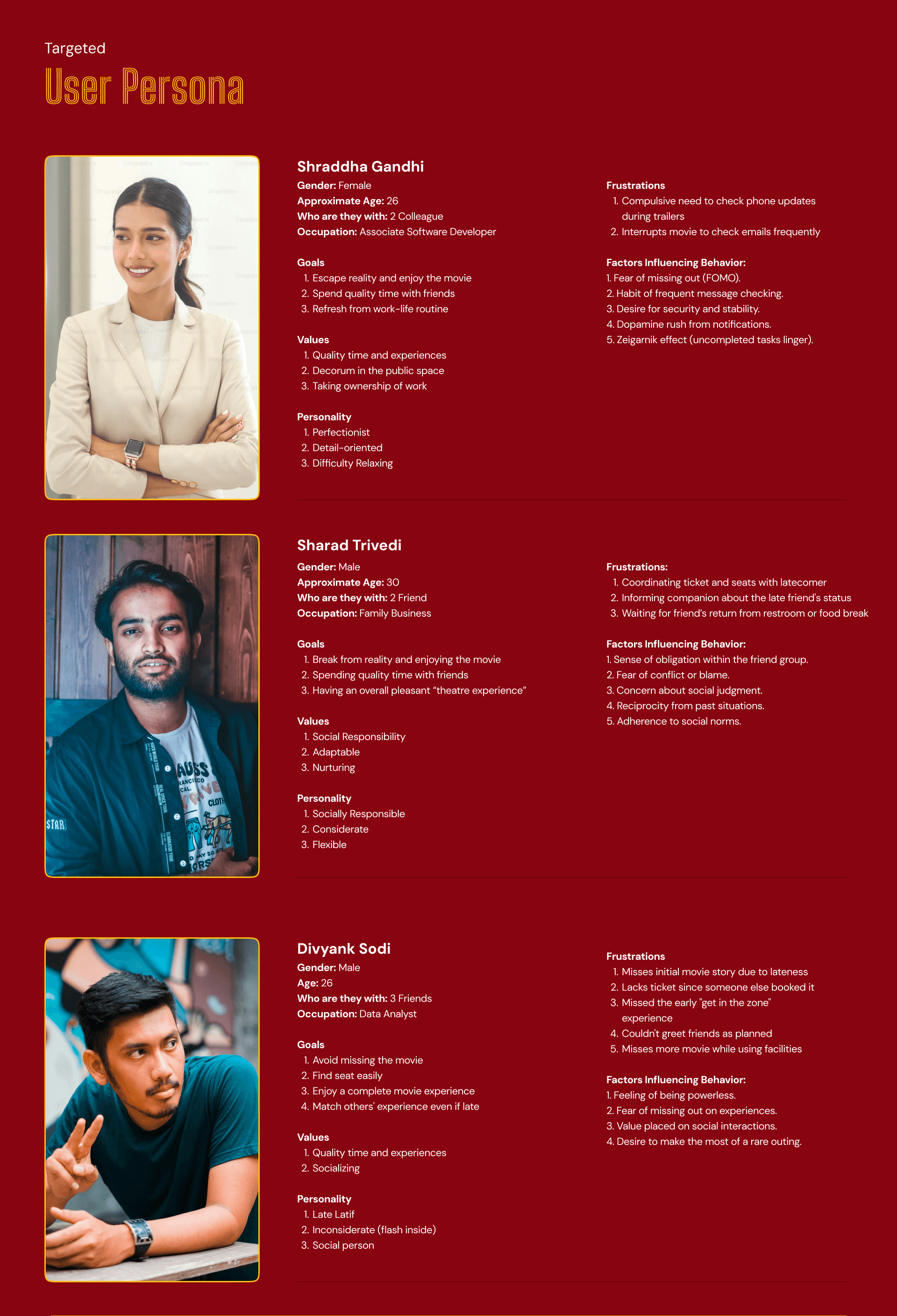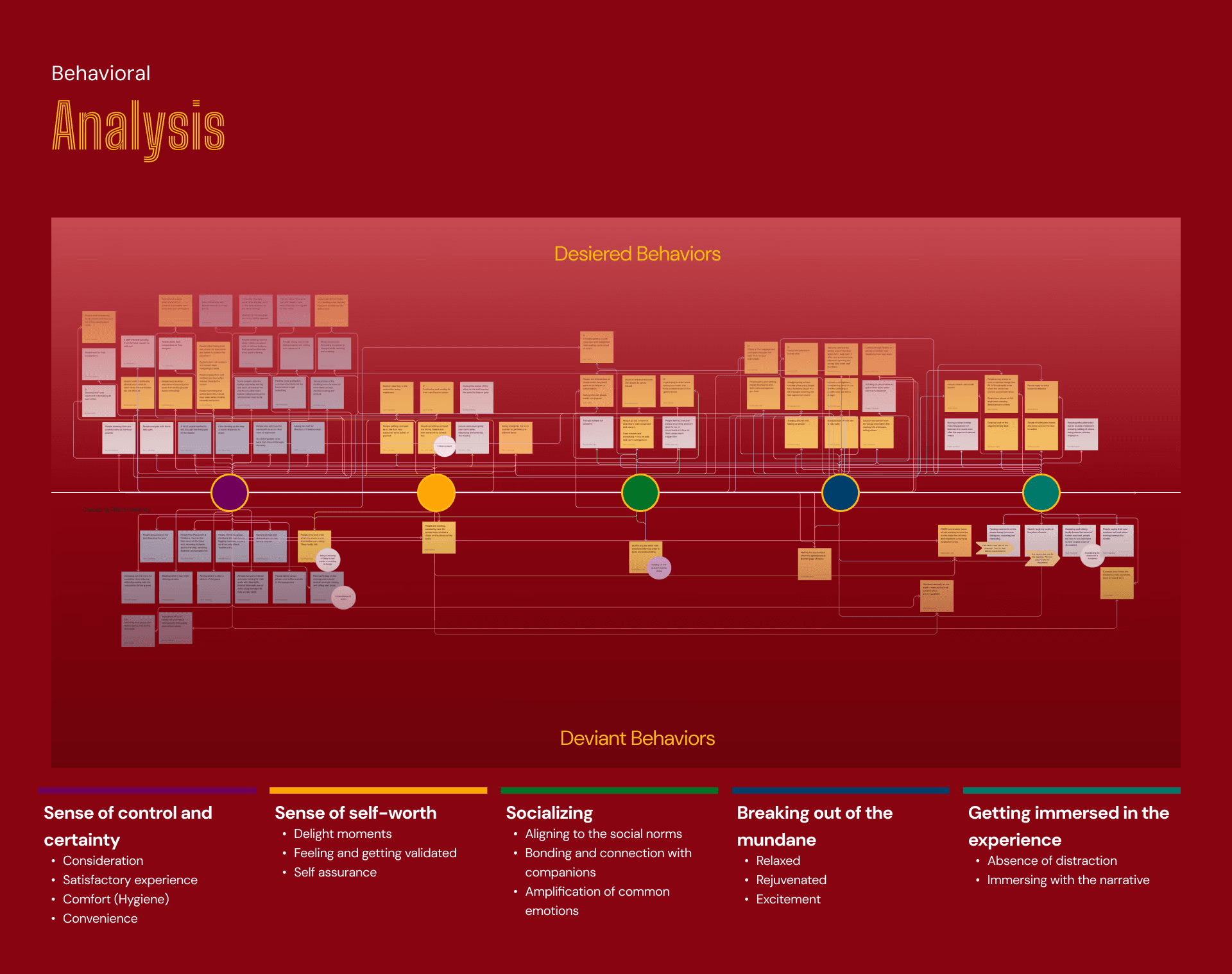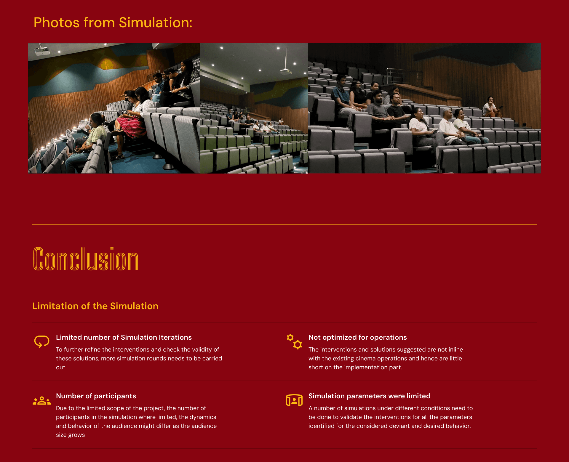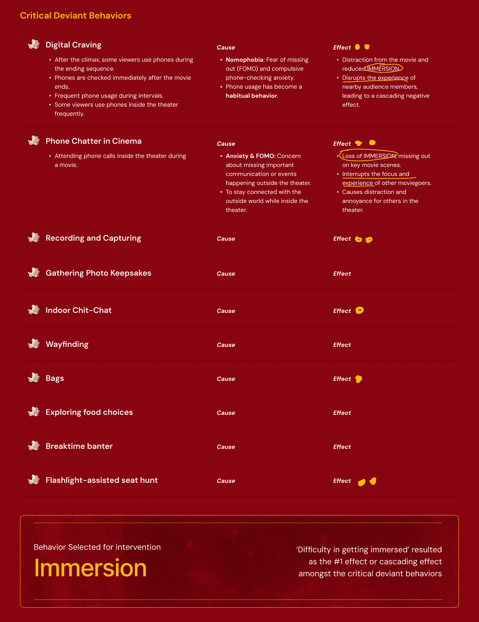 This project was dedicated to studying audience behavior in a theater setting, with a particular focus on understanding what impacts immersion and expected behavior. By closely observing theatergoers, we documented their actions, preferences, and any instances where their behavior deviated from the norm. This careful observation allowed us to identify the root causes behind behaviors that disrupted the immersive experience, whether it was due to environmental factors, distractions, or social influences. To address these issues, we designed a series of subtle yet targeted behavioral interventions. These interventions, or nudges, were intended to encourage contextually desired audience behavior, enhancing the theater experience without restricting personal freedom. This project underscores the importance of creating environments that foster deep engagement and seamless immersion.