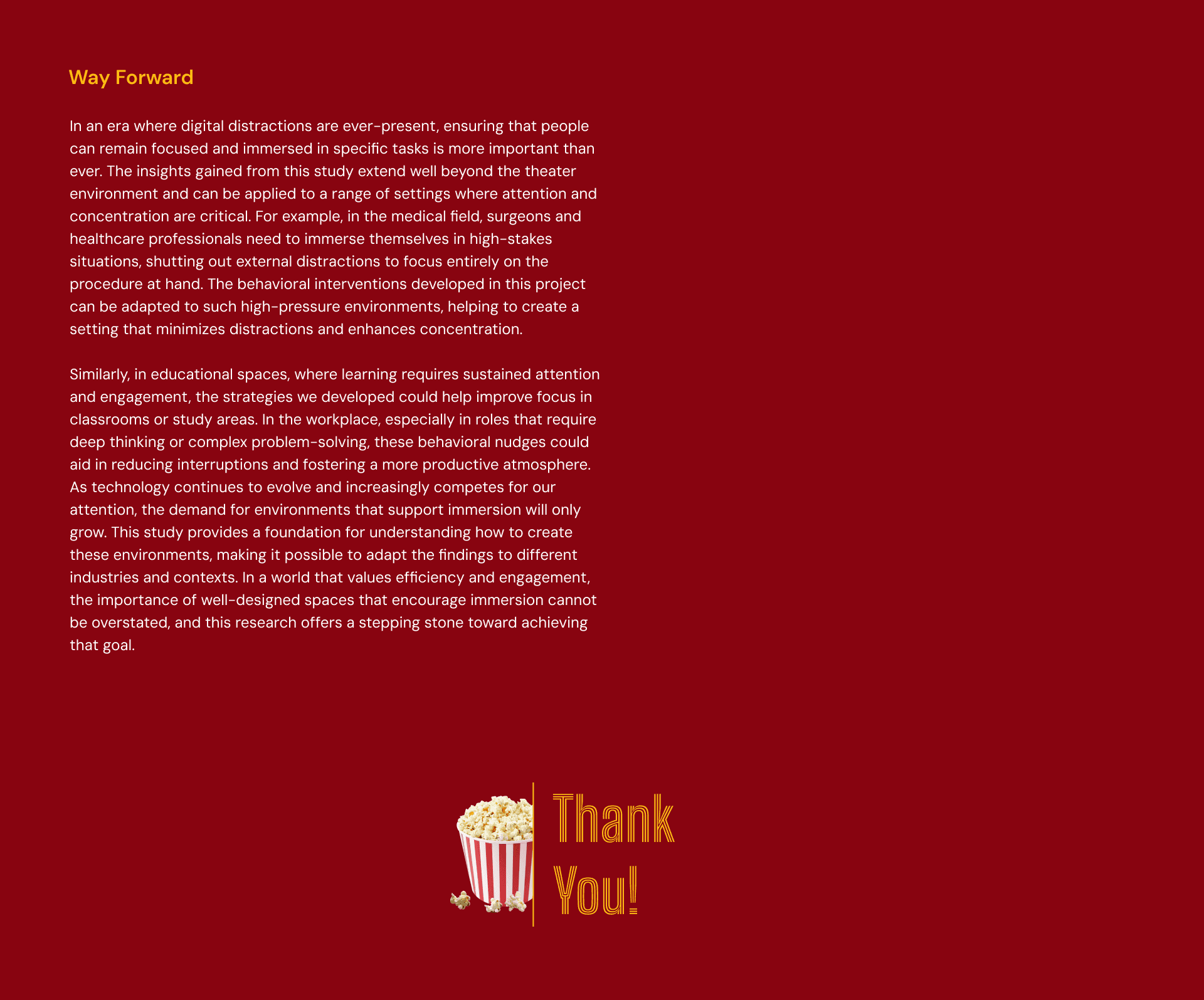 The lessons learned here suggest that such strategies could have a broader application in other fields where maintaining attention and immersion are crucial. By examining how space design and subtle cues can influence behavior, the project sheds light on how similar techniques could be used outside of theaters.